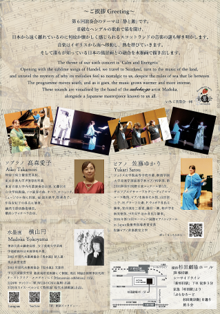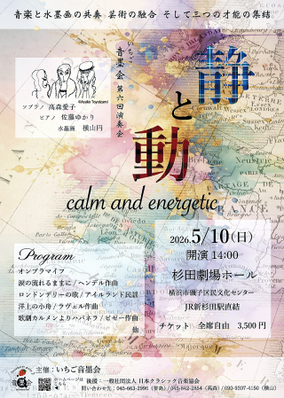 第6回いちご音墨会演奏会~静と動~を開催致します。荘厳なヘンデルの歌曲で幕を開け、日本から遠く離れているのになぜか懐かしく感じられるスコットランドの音楽の謎も解き明かします。日本の有名な風景画とピアノの融合にも挑戦します!